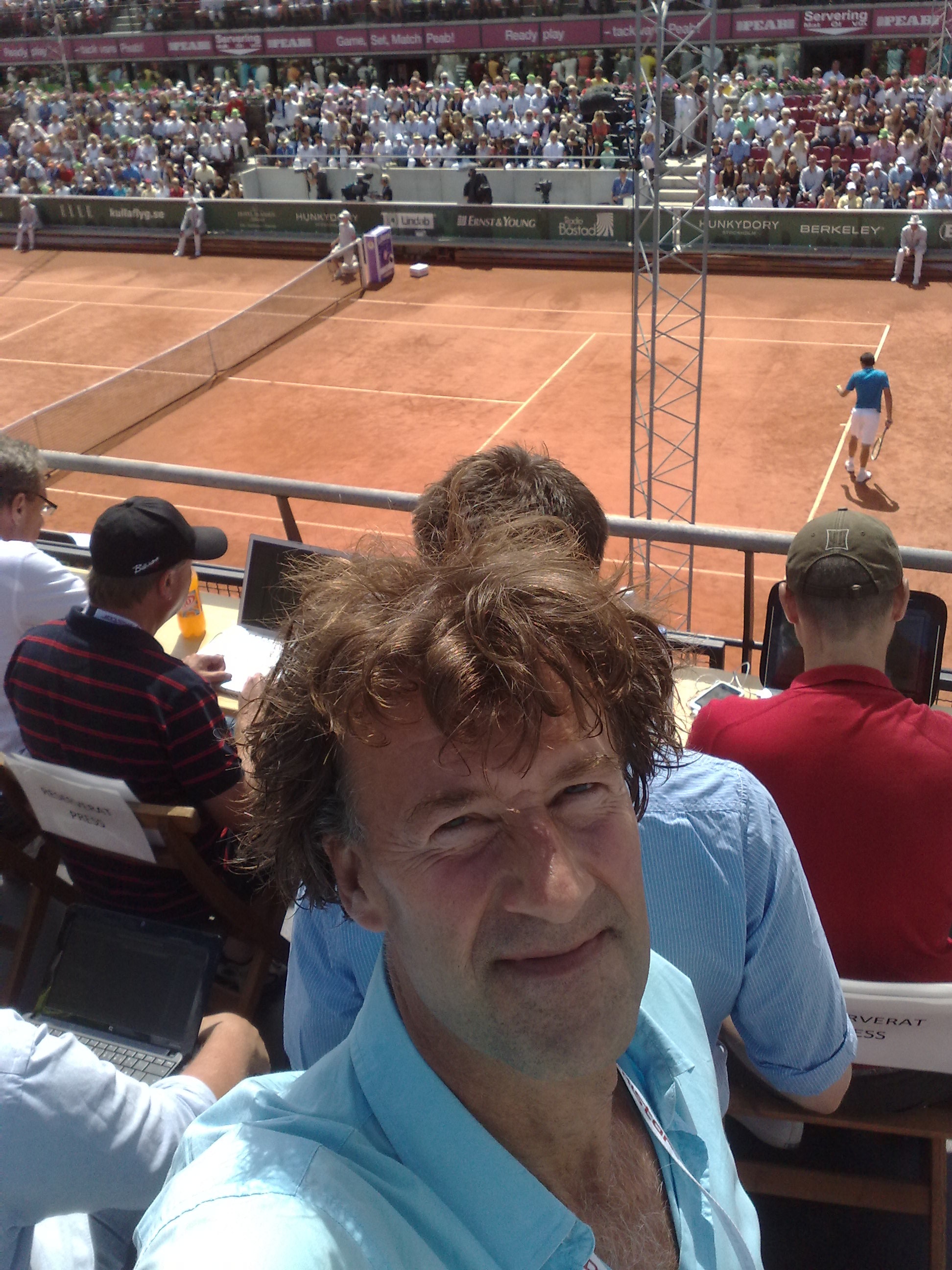 Almagro servar i bakgrunden. I förgrunden Pressen – inte direkt servad med skrivplatser. Från vänster: Svenskan Arnesen i vitt. Därefter Wiman på SDS, Expressens Forsell och Stefan Holm på Sportbladet. Därmed var alla skrivplatser fullsatta. Eurosport.se med fickdatorn i knäet.