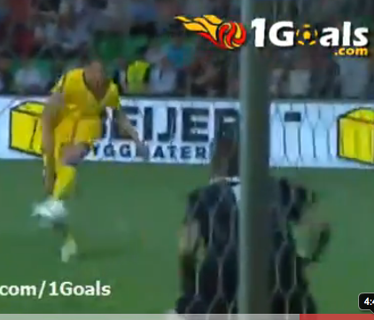 Det positionella misstaget är dock mindre i allt ( utom just antal meter) i jämförelse med målvaktens positioner. Vid Elmanders ganska dåliga studsande skott är målvaktens utgångsposition att han har stolpen alldeles till vänster om axeln. Vid Gerndts mål täcker han faktiskt mer av stolpen utsida och kortlinjen än målet. Vid båda målen ( i alla fall Elmanders) hade det räckt att han tagit ett långt steg snett utåt så hade han fått bollen på sig.