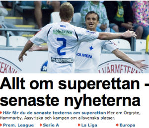 Skärmdumpade 19:58 i dag, lördag den 18 juni 2011. Visst är det fantastiskt! Snacka om NYHETER. Inte enbart att Örgryte plötsligt flyttats tillbaka till Superettan utan även att texten illustreras av IFK Norrköping, Henke Larsson och Linus Hallenius.