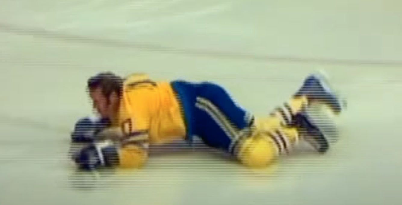 När sedan Tumba kommit upp på benen skrinnande han över isen, tog pucken och sköt mot det tomma mål som bara hade ett litet papper spänt framför sig. Men pappret stoppade Tumba, för andra gången på 10 sekunder. Tumba tog returen och sköt nu mål, på pappret. Varefter han jublade vilt och länge.
