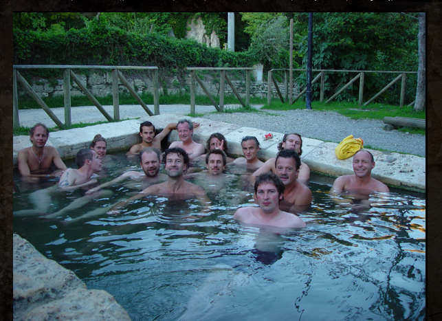 Efter triumfen och den enda flaska mousserande vin som gick att uppbringa en lördagskväll i San Casciano gick vi och lade oss i den kommunala källan med italiensk burköl (när man är nybliven världsmästare funkar allt). I det 30-gradiga vattnet låg vi sedan länge och åsåg inte enbart solnedgången över de toscanska kullarna utan även stjärnvalvet växa – över våra huvuden. Varefter det blev stor bankett och en traditionell runda på Bar Centrale innan vi återvände till källan på efternatten. Foto: Kristian Himmelstrup.