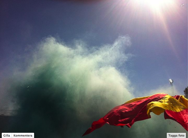 Tog med en fotbollstokig argentinsk tjej på hennes första europeiska match och hon njöt av ett los hinchas (översattta ) humor, av hur fredligt allting var och inte minst av ”celeste y blanco”: att det var hennes färger överallt. Den stora flaggan är mer helt klart argentinsk än himmelbå. Bara solen som fattas och den var ju ändå med på ett hörn. Och uppmärksammade också att de var ganska många kvinnor där vi stod, inte enbart några enstaka tjejer.