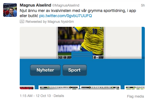 Olof Lundh twittrade alldeles nyss att han berättar allt om ”app-bråket som skakar landslaget” någonannanstans. Nej, jag följer varken Alselind eller Lundh men Magnus Nyström som retwittrat båda de här nyheterna. Och Magnus följer jag! Av egen fri vilja! Eller gjorde. Nu har jag fått tio enstaviga hockeytweets på en timme. Likt en liverapportering med dålig täckning.