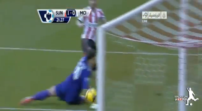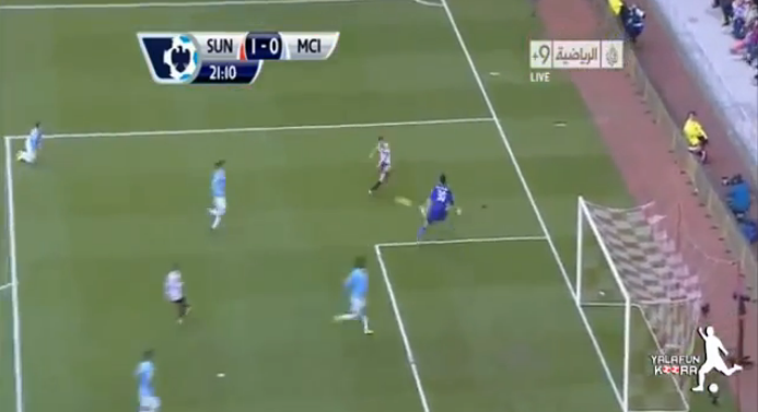 Låt oss börja med förutsättningarna. Han är två meter lång, ungefär. Han väldigt långa ben och armar, och har en vid ögonblicket för Sunderlandspelaren bollerövring en bra position. En mycket bra position eftersom motståndaren inte kan varken skjuta eller skruva från sin position utan att vända upp, eller ta ett svårt avslut med vänstern vilket uppenabarligen inte är hans bästa fot.