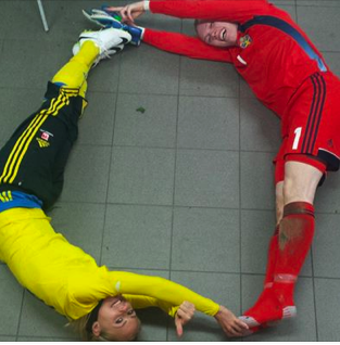 Världens första defensiva målgest?  Tyvärr vet jag inte vem fotografen men cred till hela svenska damfotbollslandslagets omklädningsrum!