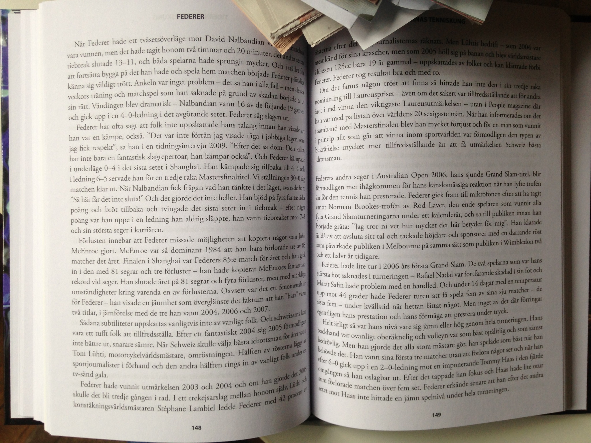 Att använda ”verksamhetsområde” som synonym till sport/idrott känns minst sagt konstigt. Sedan fortsätter Bowers berätta att detta är den fjärde Federerbiografin han gett publicerat – på åtta år. ”Den här boken kompletterar de tre tidigare” skriver Bowers och konstaterar att sättet vi ser på Federer ”som människa och mästare har förändrats” på de här åren.