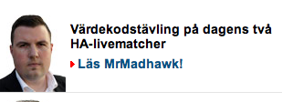 Kvällsposten har en hockeykrönikör som heter Mr Madhawk, tror jag. Inte ”MrMadhawk”. Men vad som intresserar mig är inte i första hand namnet utan rubriken – här har jag uppenbarligen inte hängt med i sportens nyspråk. Jag har ingen aning om vad en ”värdekodstävling” är. Har det något med appar och lotter att göra? Och att det är ”på” ”två HA-livematcher” antyder någons slags tippning, med ”värdekoder”?