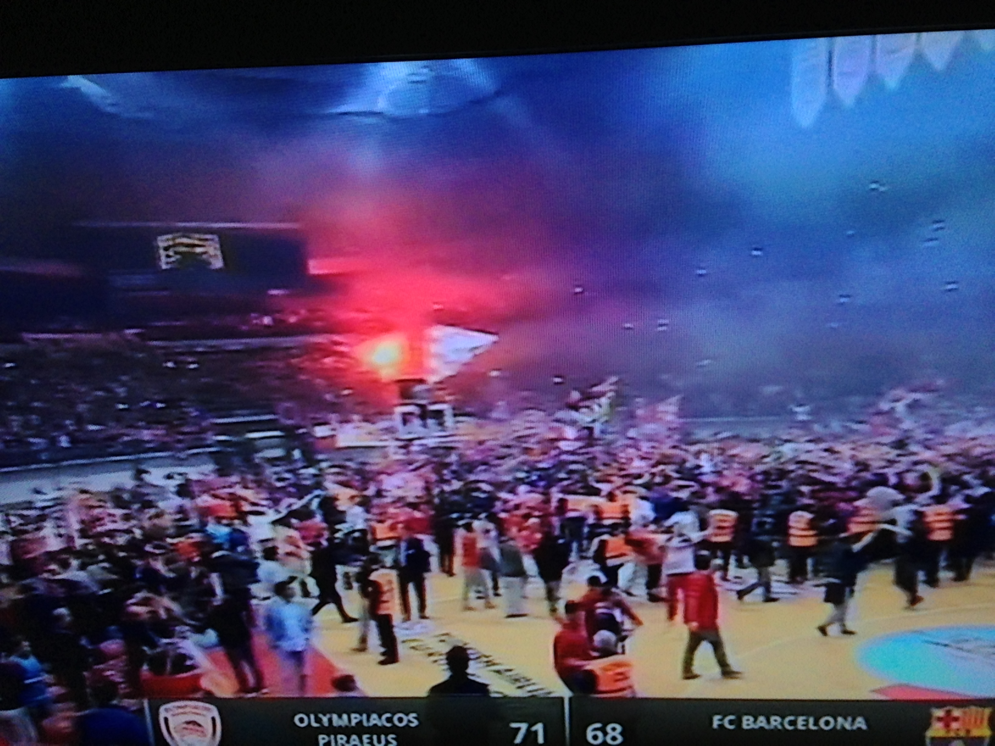 En märklig händelse inträffade i början av fjärde Q då ett kraftig knallskott exploderade 20 meter från planen. Olympiakos guard och store ledare Spanoulis reagerade instinktivt och vände sig snett bakåt. Eftersom Barçaspelaren framför honom såg både händelsen och Spanoulis nacke satte han bollen i golvet och gjorde en helt ohotad layup. Det var inte en enda hemmaspelare i närheten av tresekundersområdet.