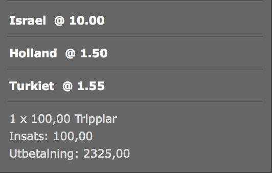 Ska man ha in en fotbollsvinnare till 10 gånger pengarna är det sista omgången av internationella cuper som gäller. Israel förlorade hemma 0-1 mot hyfsade Belgium och i kvällens retur slår motivation klass, speciellt som de två andra lagen som kämpar om playoff-platsen möts på Cypern. Det borde vara en jämn och oavgjord match länge, så länge att Israel inte dippar sista tio. Belgien förlorar visserligen gruppsegern men spelarna är numera så internationella att de skiter i det. Bara de presterar i Frankrike. Och det kommer de göra. En av två favoriter.
