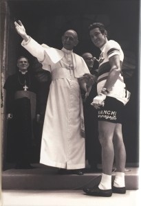 Det finns stora likheter mellan katolikers blinda tro på deras fläckfria prästerskap och cykelfansens förlåtande attityd till doping bland stjärnorna. På bilden troligtvis den sportintresserade påven Pius XI, på vars arena jag lirat boll, och en av det sena 1960-talets stjärnor, självfallet enbart dopad av den plötsliga indirekta närkontakten med Gud Faders hjälpryttare.