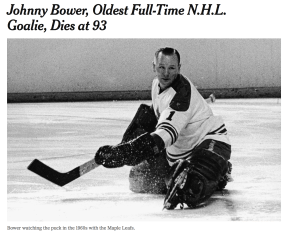 Henrik Lundqvist debuterade vid 23 års ålder och gör nu sin 14 säsong i New York Rangers. Bower debuterade inte i NHL förrän vid 29 års ålder. Spelade en säsong i Rangers, fortsatte och avslutade sedan karriären vid 45 i Toronto Maple Leafs. De första säsongerna utan mask vilket ledde till att han i princip bytte ut alla tänderna och hade drygt 200 stygn i ansiktet. Han var Ken Drydens store favorit. Vid 55 års ålder skrev han ett enmatchs-kontrakt med Maple Leafs. Johnny avled häromdagen, 93 år gammal, av lunginflammation.