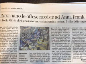 I går var jag så lycklig över en fantastisk läktarupplevelse, i dag är jag nästan bara ledsen och besviken över samma supportrar. Skillnaden är att jag förstår inte vad man sjunger och ropar, men jag kan hjälpligt tolka text. Dagens Corriere della Sera skriver: ”Rasismen riktad mot Anne Frank återkom”. Det handlar bland annat om att där vi svenskar i Författarlandslaget samlades (vid bron Milvio) sjöng Laziosupportrar antisemitiska sånger, förnekade Förintelsen och hånade den lilla judiska flickan Anne Frank i Amsterdam vars dagbok överlevde den Förintelse där flickan gasades ihjäl. Tyvärr har det alltid varit så här, i Lazio. Att jag hamnade på den ljusblå sidan i går beroende på att min vän som fixade biljetterna, Mats Lerneby, är Laziosupporter. Mats avskyr det här och för honom är det säkert värre än för mig men likväl – det gör ont att tänka på att jag stod där medan människorna omkring mig skrålade antisemitiska slagord.