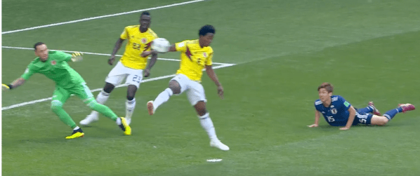 Ännu märkligare är de två andra försvararnas ointresse. Carlos Sánchez, 32-årig defensiv mittfältare i Espanyol (utlånad från Fiorentina), löper inte max förrän Osako kommer in i straffområdet. Han springer halvfort medan japanen håller på att få frilägen. Varför man inte bryr sig förstår jag inte. Förstår inte heller de lagkamrater som inte maxlöper tillbaka till egen box efter lite drygt två minuter. Den ende som verkligen maxar är vänsterbacken (nr 17). Jämför hans fart och de andra så förstår ni att de absolut inte springer sitt snabbaste. Deras ointresse gör att de fem colombianer som är före ”andra japan” vid omställningens början inte tar returen. Och sedan hoppar alltså Carlos Sánchez upp och tar bollen med en hands som absolut inte kan vara tydligare än den är – han ber om straff och utvisning. Om man spelat professionell fotboll på högsta nivå i 13 år – varför gör man så här efter lite drygt två minuter i en VM-premiär?