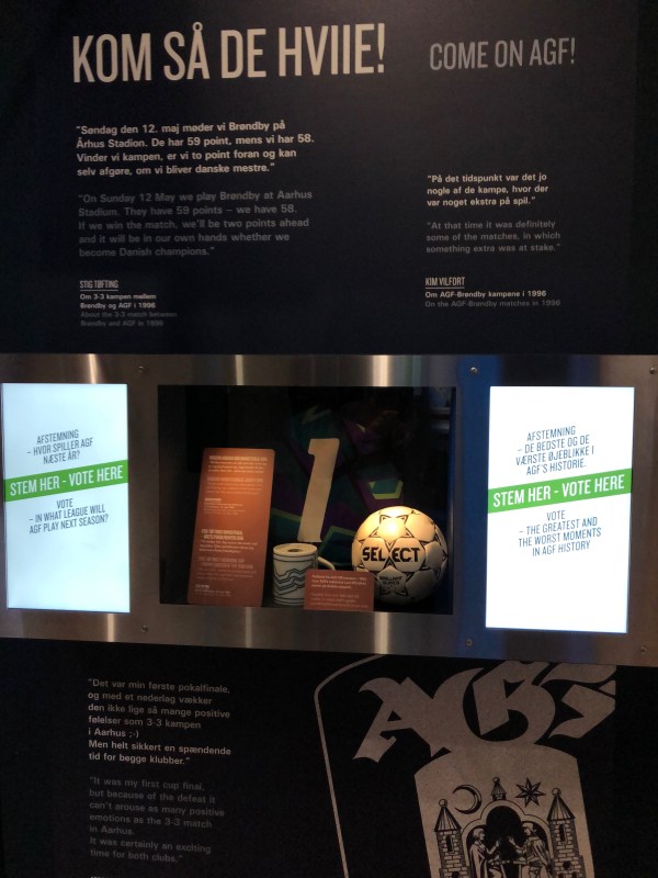 Aarhus Gymnastikforening, bildades 1880 och fotbollssektionen 1902. Det var en sammanslagning av byn bästa boldklubbar och blev inte så bra som man tänkt sig. I den Gamle By (som samtidigt är ett stadshistoriskt museum) får fotbollen en liten marginell vrå i en bortglömd idrottsavdelning. Inte heller i de två årtal som symboliserar 1900-talet (1927,1974) på museet återfinns AGF.