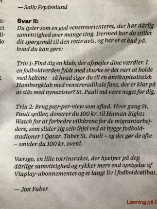 Så har vi Brevkassen. En av flera närmast argumenterande avdelningar som ställer frågor och försöker finna svar. Ofta flera, mångsidiga. Brevkassens mailbox fylls av lättsamt formulerade frågor om livet som 2020-socialist. Det är komplicerade, ofta moraliska vardagsproblem besvarade av två specialister och liknar ”Allvarligt talt” fast med klar vänsterklang. Eller en förhistorisk ”Tant Rysdahl” i studenternas ”Lundagård” i början av 1990-talet. Ibland är det lysande. Som nedanstående beklagan och de icke politiskt pragmatiska råden till svar. Detta är sidan där den danska vänsterns självironi kastas i ansikte på en – något tyvärr den svenska vänstern i princip aldrig anammat eller förstått vikten av. Tvärtom är väl just frånvaron av humor och självdistans det som karakteriserar den politiska svenska vänstern, och tyvärr delvis även vår tafatta miljörörelse. Så i svallet av Paulis episka trepoängare i helgen publicerar jag här ett litet utdrag ur lördagens tidning.