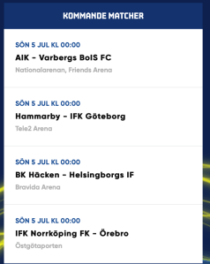 Klickar vi i dag (onsdagen den 3 juni kl 10:30) på det officiella spelprogrammet blir det ”AIK-Varbergs Bois FC 5 juli 00.00”. Klickar vi på ”Kommande matcher” så är det allra först ”Örebro-Djurgården 4 april 13:00”.