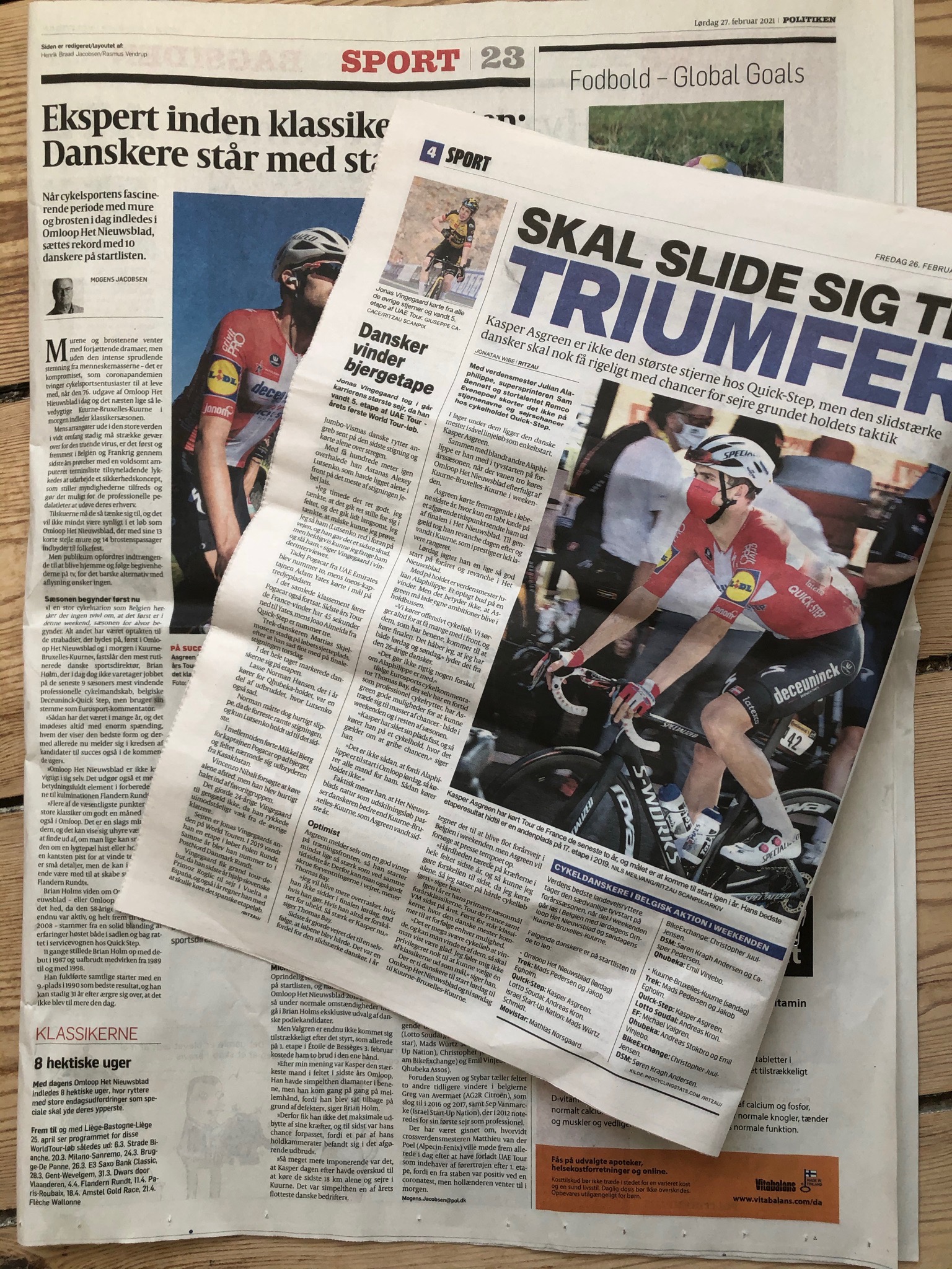 Stort varmt ljus från ljusblå himmel, plus 6 grader och simpla 2 m/sek. Vi tar på cykelutflykt i Nordhamnen (ett stilla Öresund, ny spännande bostadsarkitektur). Samma dag har de stora cykelklassikerna säsongspremiär. ”Omlopp Het Nieuwsblad” klättrar uppför korta, branta”murar” ( ibland upp till 20 graders lutning) och över gammal kullersten. Det innebär otaliga punkteringar, många fall i låga hastigheter och intensiv kamp. Med andra ord bra sportunderhållning. När vi vänt hem igen. De danska tidningarna satsar stort på cykelbevakning men så är det inte enbart med tio danskar utan även tre av favoriterna till dagens lopp som kulminerar med den Vallonska pilen (Fléche Vallonne) om åtta veckor. Kasper Assgren, Mads pedersen och Søren Kragh Andersen kommer alla höra tala om sig, från sadeln, den här våren. Det är mest belgiska lopp men 20 mars är det dags för Milano –San Remo. Ingen kullersten, inga murar men den stortens skönhet och fart som den flamländska och vallonska loppen saknar.