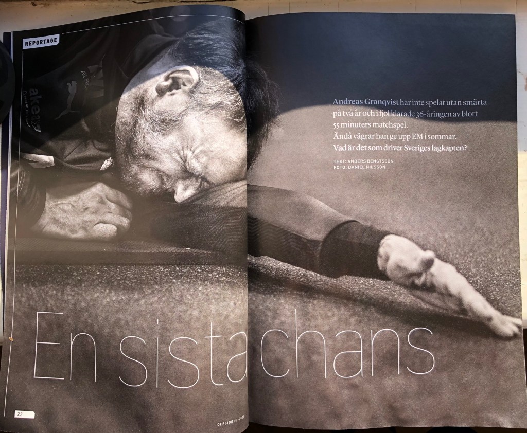 Om Andreas Granqvists alla ambivalenta roller, den oerhörda pressen och den enastående viljan som alltid har sällskap av en molande smärta, har Anders Bengtsson och Daniel Nilsson gjort ett utomordentligt reportage. När Offside är så här bra, kan utnyttja både platsen och tiden och ge texterna tålamod så är den oslagbar. Jag vill möta en Offside full av skador, ekonomi, politik, korruption och nördig fotbolls know-how – det tror jag är magasinets framtid.