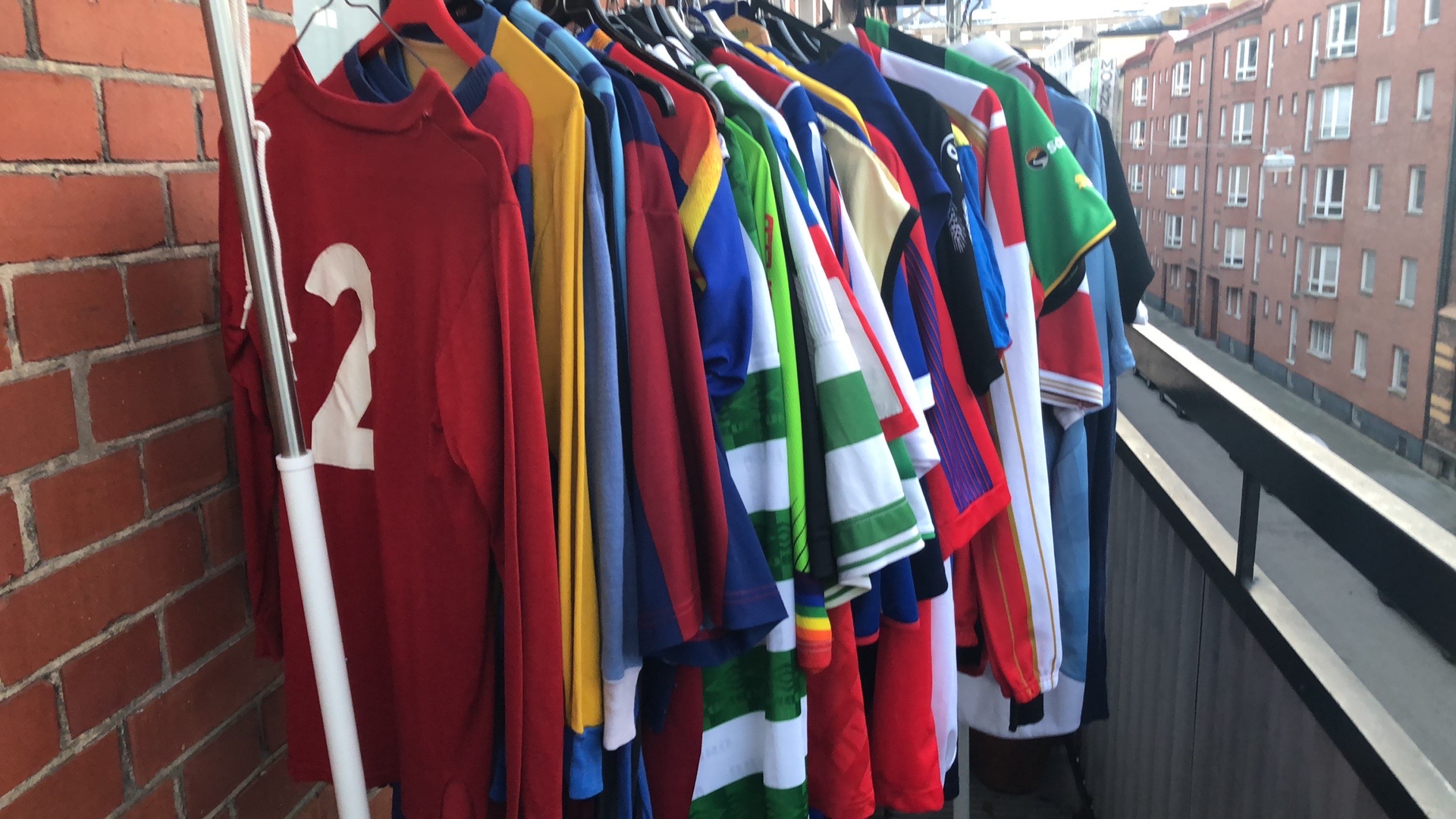Ps Där hänger faktiskt också några cykeltröjor, bland annat den lätt Mariscal-inspirerade katalanska landslagströjan från säsongen 2015 med vacker rödgul hals även om den har märkligt stora vita inslag… …cyklister är mer färgresistenta än fotbollsfans.