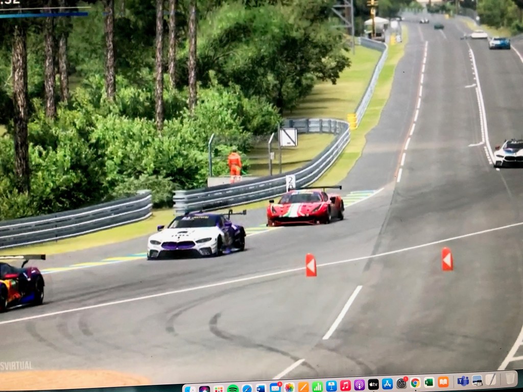 Där satt ett tiotal av världens bästa e-sportförare och körde hela loppet. Alla i riktiga racingstolar med hörlurar och asbestoveroller i fall spelkonsolen skulle börja brinna. De hade t o m förarbyten och däcksbyten och de som avgjorde tidstilläggens längd för krascher och dylikt var sex domare i vita overoller framför en vägg av skärmar.