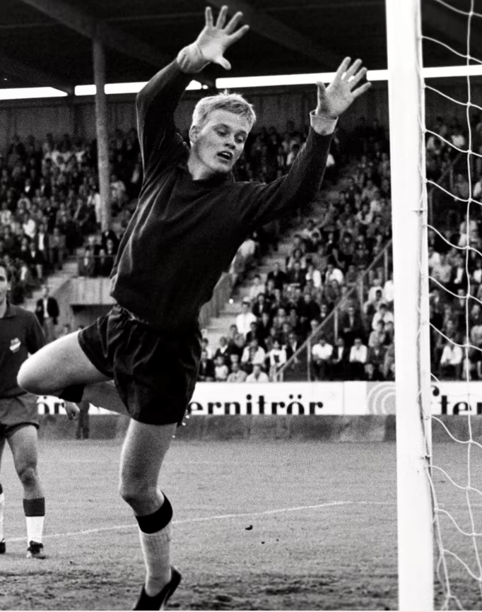 Ronnie hade inte enbart ett par sjutusan till polisonger, han var utan tvekan världens bäste fotbollsmålvakt under ett par år under mitten av 70-talet. På den tiden man kan kunde vara världsstjärna men ändå ganska vanlig människa. Han är kanske den siste levande målvakten som stått i A-landslaget utan handskar. Och som här på bilden från 1968 och allsvenskan: i en tröja utan klubbmärke, utan vadderade byxor och armbågar. Totalt oskyddad samtidigt som underlaget inte var mjukare på den tiden – Ronnie tränade, liksom jag själv, ofta på grusplaner. Fast Ronnie hade ju en mustasch som man kunde stoppa frisparkar med och ett par polisonger i världsklass. Trots allt ansiktshår – att att vara fotbollsmålvakt var ett kall på hårt underlag.