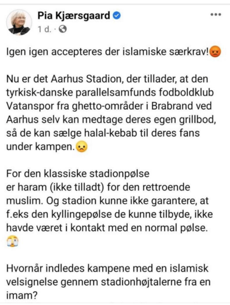 En liten fotbollsklubb i ett invandrarområde i Århus. När de har flyttat sin hemmamatch till en större arena tar de med sin halalgrill. Det får den f d partiledaren för Sverigedemokraternas motsvarighet i Danmark att gå i taket, på fb. Sådan är rasismen, I Danmark, i Sverige.