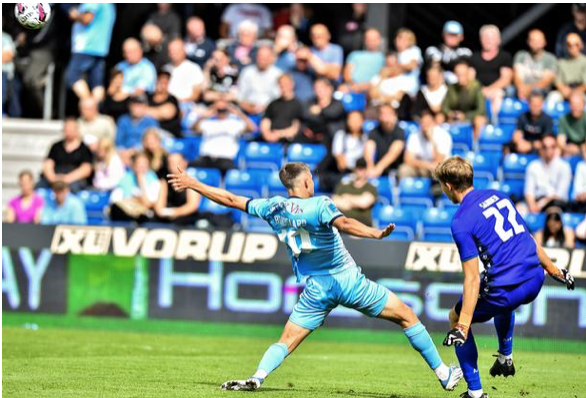 Snackade de om insparkarna före matchen? Aalborg har uppenbarligen en variant med de två mittbackarna 7-8 meter på var sin sida om målvakten. Istället för att Theo eller någon av dem slog långt så spelade de i sidled. Två passningar och tvingades Theo tjonga iväg bollen men så långsamt att Filip Bundgaard han blocka med en fot. Efter 50 sekunder. Bollen gick ut över långlinjen men det var riktigt, riktigt nära. Allt gick helt enkelt alltför snabbt för Theo.