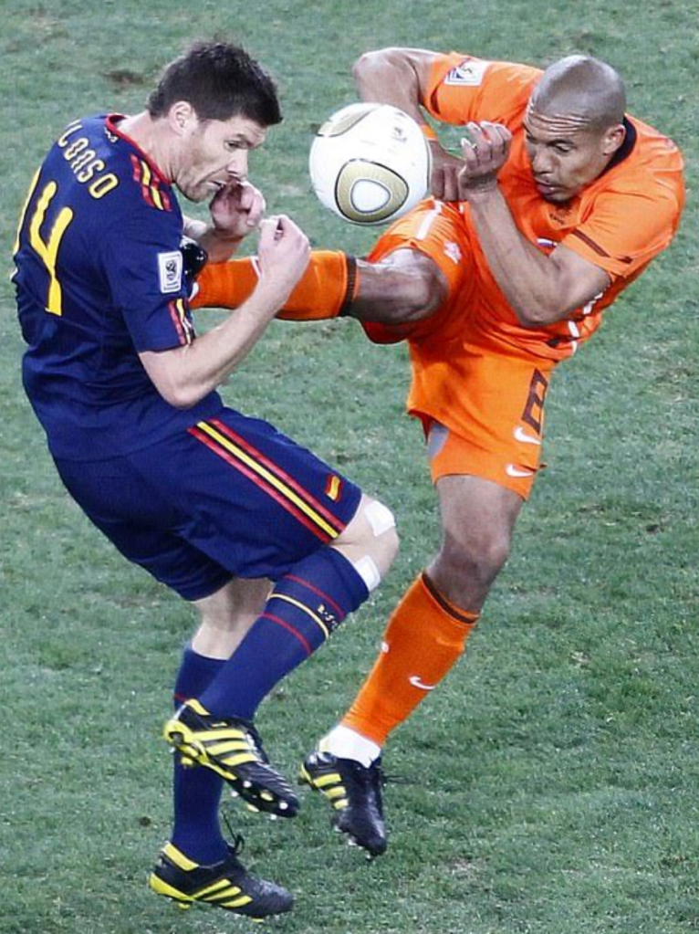 Det jag minns allra bäst av VM-finalen 2010 var De Jongs karatespark. Eftersom finaldomare har stränga order att inte visa ut någon kommer vi troligtvis få se en fotbollsmatch på söndag som allra mest påminner om finalen 1990: ett lika fotbollsmässigt svagt Argentina som idag hade tagit sig hela vägen och försökte skrämma Västtyskland. Det resulterade i utvisningar.