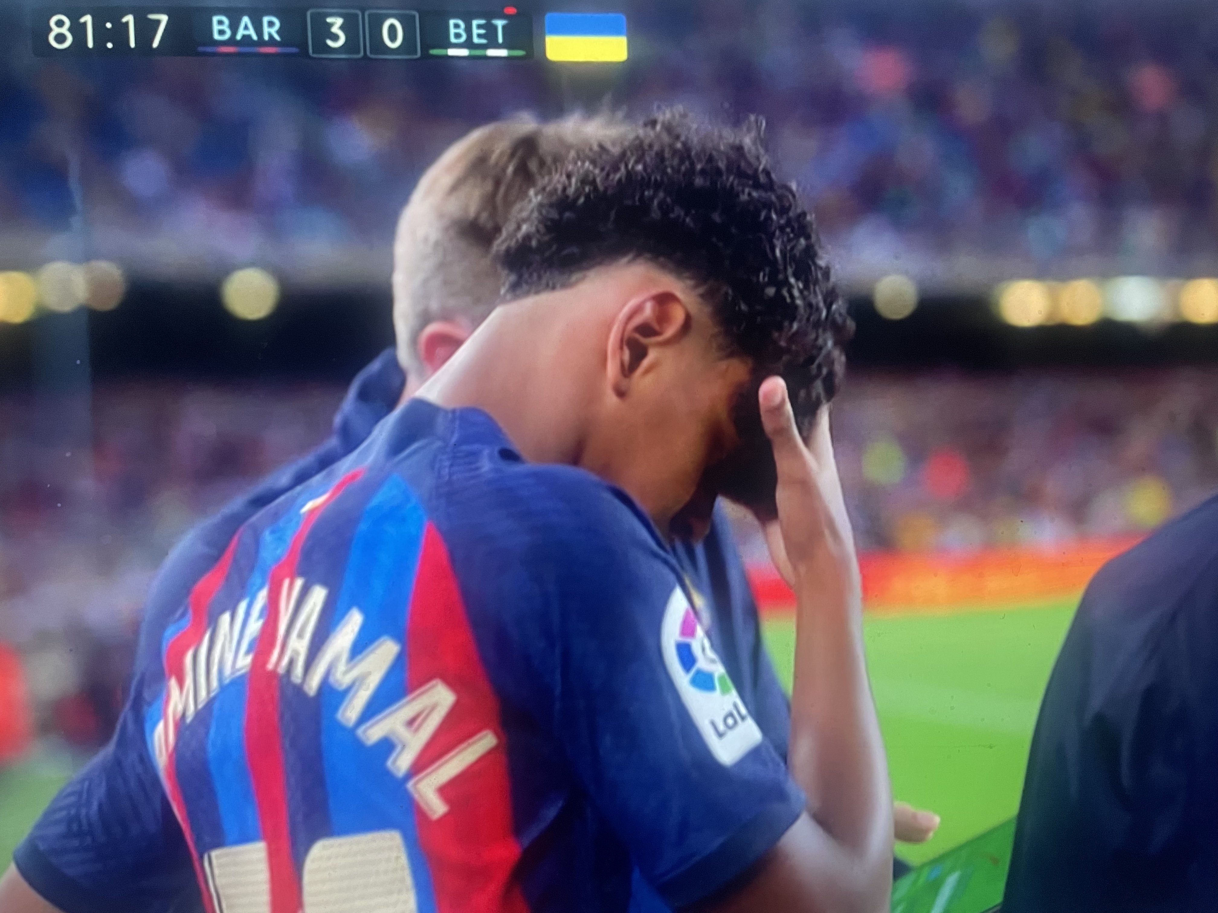 Yamal kom in mot ett Betis reducerade till nio spelare. De grönvita fick en mittback skadad tidigt och den inbytte lyckades dra på sig två klara gula på 25 minuter. När sedan 40-årige Joaquin blev inbytt som femte spelare och nästan omedelbart knäskadad var tragedin ett faktum (matchen förlorades redan en timme tidigare). Legenden annonserade tidigare i veckan på en tårfylld presskonferens att han slutar efter säsongen. Med sju matcher kvar skulle han ta sig förbi fd Barçmålvakten Zubizarreta som gjort flest matcher i La Liga någonsin: 622 matcher. Joaquim har 617 med sex omgångar kvar men troligtvis tog en 23 år lång karriär i Real Betis och några säsonger i Valencia, slut samtidigt som Yamals startade.