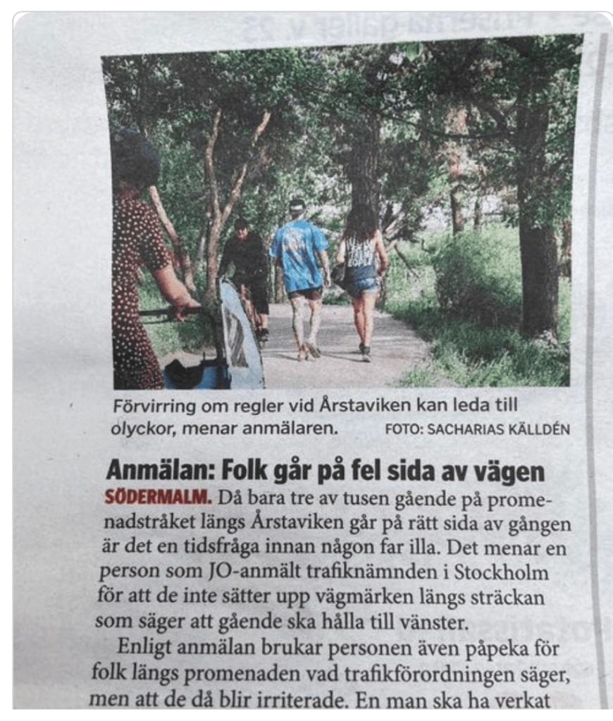 Det är först när jag läser DN-notisen som jag inser hur djupt krismedvetandet sitter på Södermalm. Det är en sak när man ger sig på cyklisterna för att de cyklar alltför snabbt uppför Götgatsbacken eller bär fel byxor på men att sitta och räkna gåendes trafikmönster på skogsstigar antyder att man inte mår så bra i den grönvita själen.