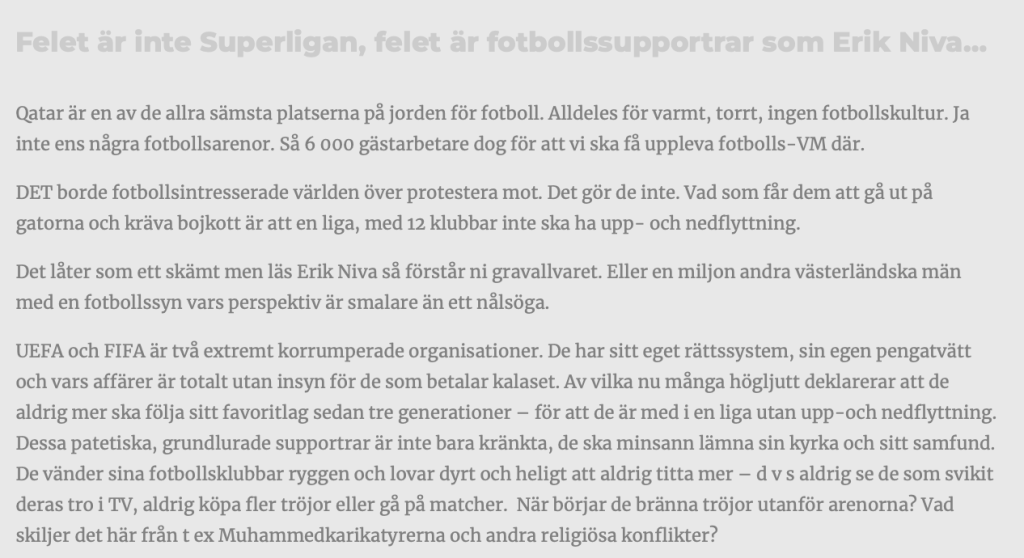 Idag har det f d socialdemokratiska kommunalrådet Nilsson helt sålt sig till FIFA. Sportwashing och korruption har gått så långt att till och med Olof Lundh (avslöjar han i dagens krönika ) bytt fot. Han hoppas Superligan vinner. Jag undrar vad Erik Niva kommer skriva – han som hotade sluta skriva om fotboll ifall Superligan realiserades.