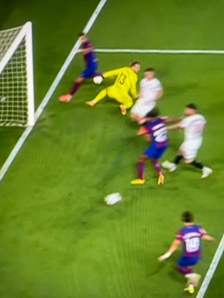 I mitten av andra, vid ställningen 2-1 till Barça slår Koundé en av alla meningslösa, alltför sena och korta passningar på offensiv planhalva. Men den här gången fortsätter han framåt. Han springer in i den löpväg som skapat åt Ferran Torres, och dessutom alltför tidigt. Han är två meter offside när Gündogan smeker fram en perfekt boll i djupet till Ferran Torres som passar snett inåt bakåt till Koundé. Som missar öppet mål. Öppet, tomt, övergivet hur många synonymer som helst för att hans miss är totalt oförklarlig. Ja, han får en liten knuff i ryggen och ja, han är offside men är det verkligen därför han inte kan bredsida in en boll rakt framför ett tomt mål från lite drygt två meter? Är det verkligen så att han kröner en usel offensiv löpning och kommande offsideavblåsning med att göra ännu ett stort, genant fel? Jag förstår att han inte jublar ifall han har känslan av att han varit offside men varför då fortsätta löpningen och varför inte bar aslå in bollen? Eller är det något annat?