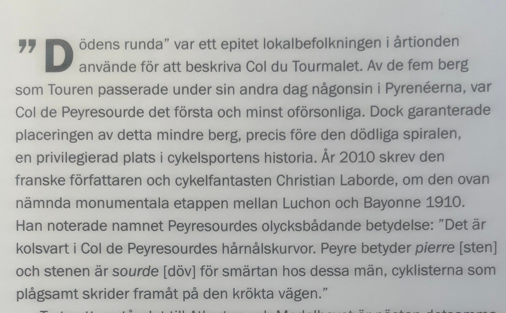 Dagens etapp startar halvvägs upp för Col de Peyresourde (7 km och 8 % genomsnittlig lutning). Gröna fält, porlande bäckar, plus smärta. Tom Simpson vann sin första etapp just här. Fem år innan han dog på ett annat berg. Höjden med namnet ”stenarnas dövhet” är blott början på en dag som bjuder 4800 höjdmeter. Det är fortfarande en tokdopad dansk som varit snabbast till toppen. Upprepar det sig i dag?