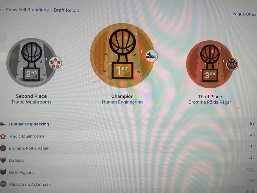 En spelare jag borde ha draftat tidigare är Zion Williamson. Han verkar äntligen hel och frisk, han har fått en bra pg men en konkurrent tog alla de spelare jag saknat alldeles innan det var min tur. Känns nästan som om det var en medveten taktik. Men det ända som är riktigt säkert inför årets Human-säsong är att jag kommer sist i ft-kategorin.