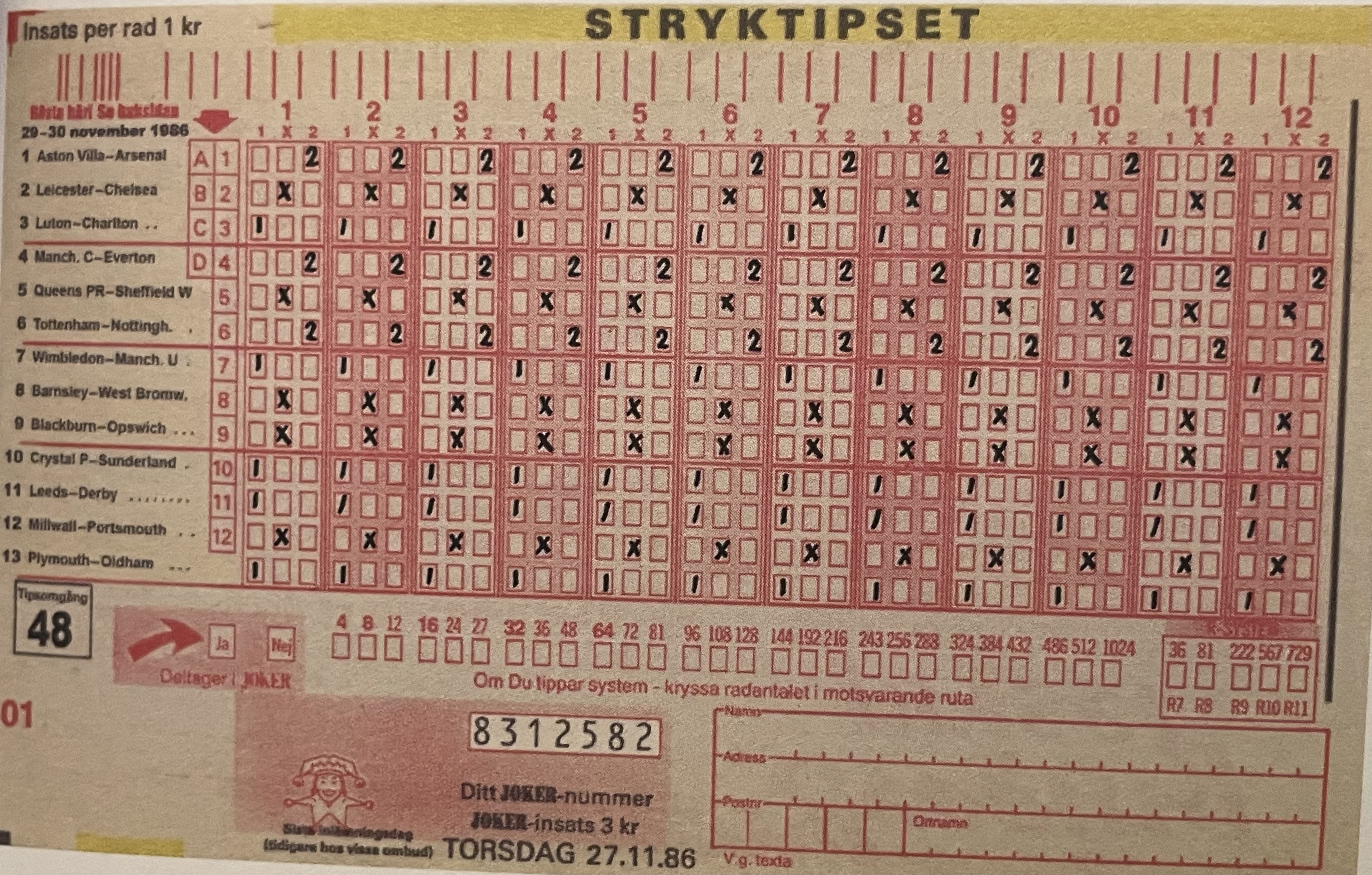 Tre tunna blad till stryktipskupong (en med karbonpapper) är ett av vårt lands minsta men viktigaste manliga artefakter. Ett kommande museum över Sverige på 1900-talet kommer ställa ut en papperslapp med 13 fotbollsmatcher och 390 små rutor. Det handlar om att spela, drömmen om en klassresa på 90 minuter och en fotboll som alltid var fest, i teorin. För miljoner skandinaviska män i minst 20 år. Ett vardagsrum, utan sömmersketippare, där drömmar, dålig fotboll och många öl möttes på lördagar under vinterhalvåret.