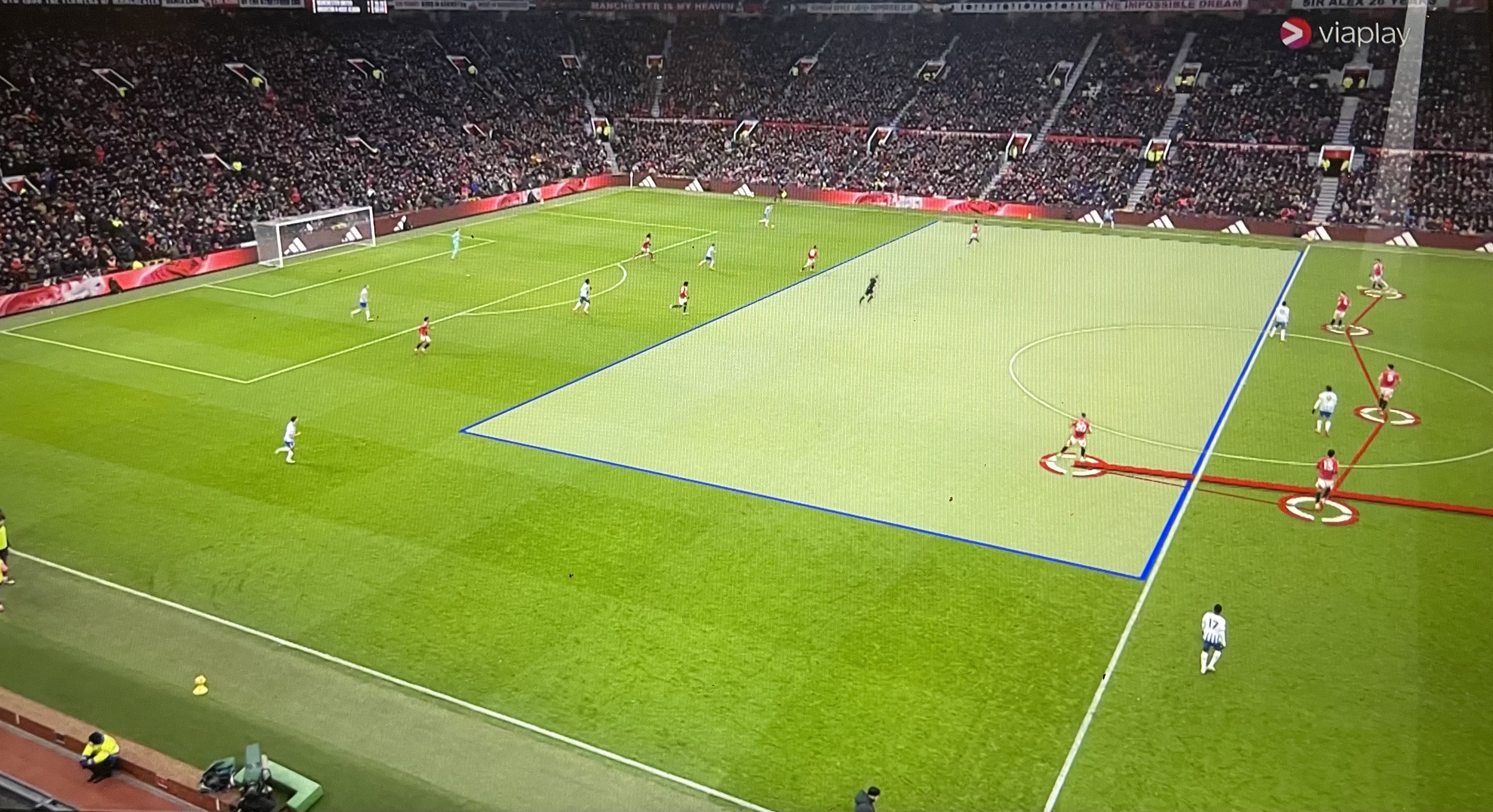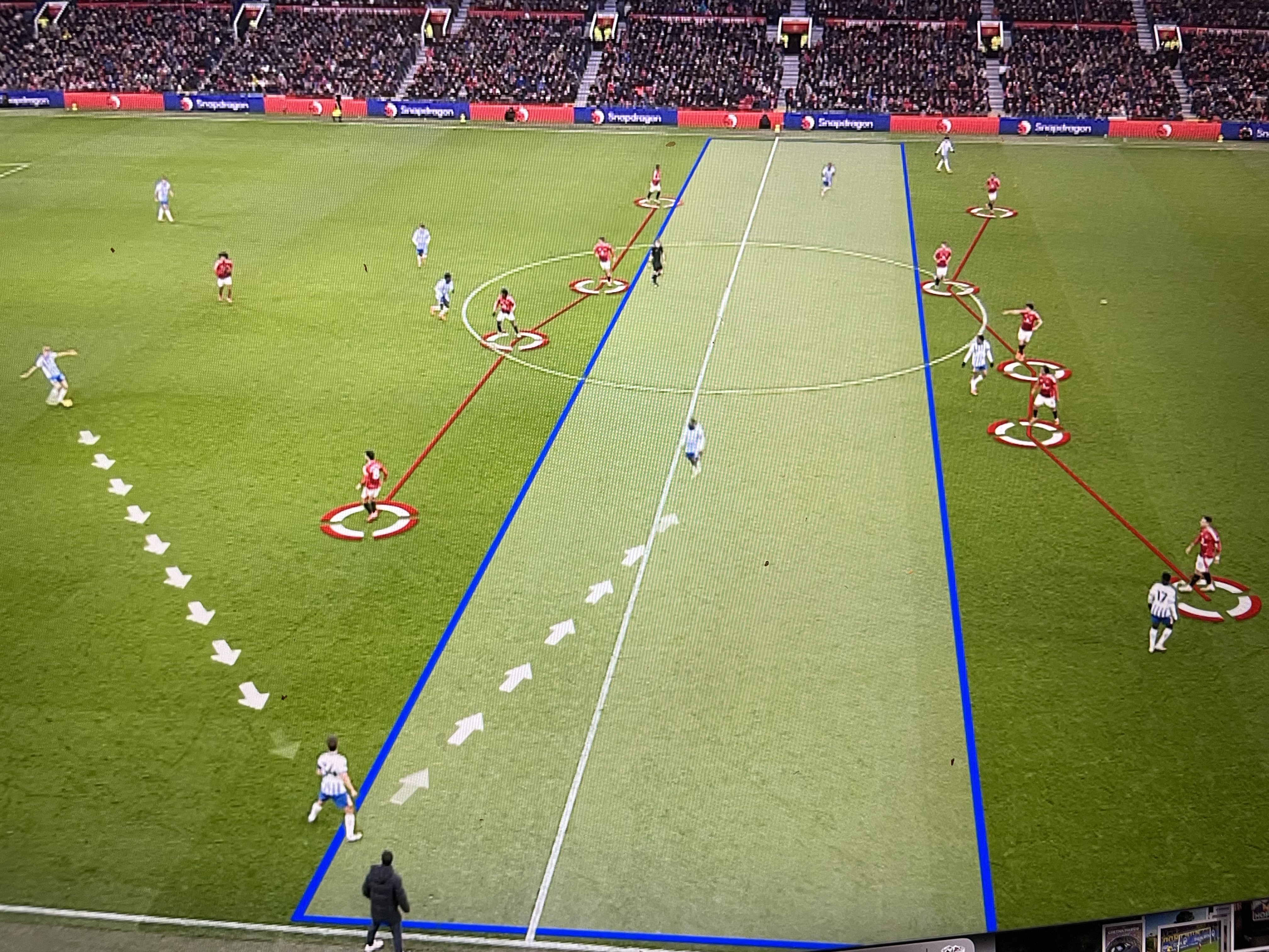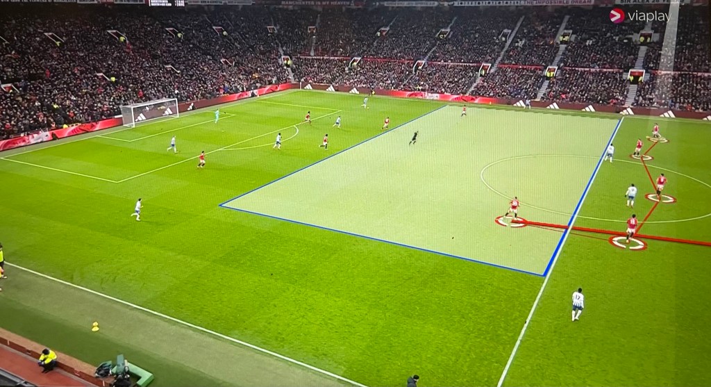 Backlinjen leds av den gamla, långsamma Maguire som omedelbart faller så fort motståndarna tar sig över egen tredjedel. Detta sker alltså inte när de leder och ska försvara utan vid underläge 1-2 på hemmaplan. Ok, det beror delvis på att Brighton har en smartare tränare än United och skrämmer Maguire och de övriga i hemmalaget genom att ligga högt med fyra spelare.