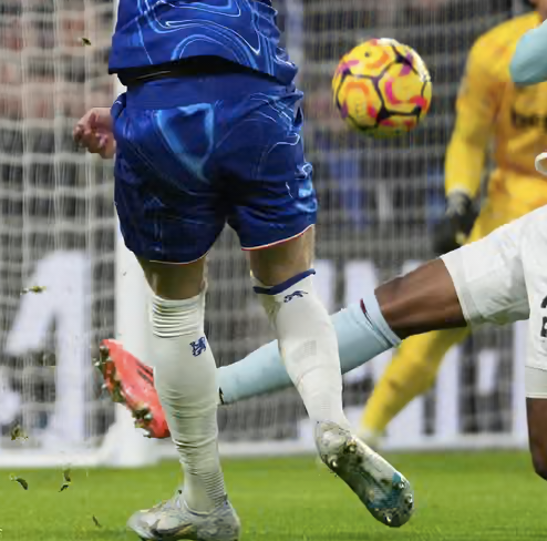 Jag förmodar att de som avgör (VAR?) menar att bollens ursprungliga bana inte hade slutat inom målramen. Det är väldigt svårt att avgöra med tanke på att det är mindre än en meter mellan Cole Palmers tillslag och benskyddet.