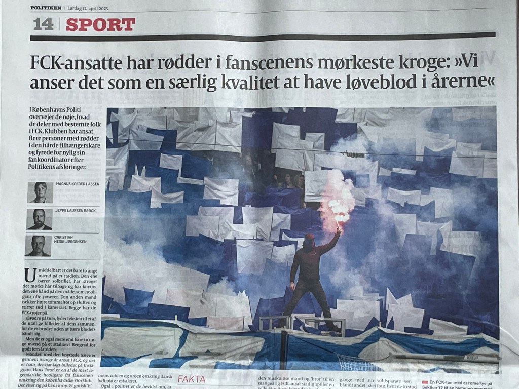 Köpenhamnsderbyn är heta, såvida inte Lyngby spelar. Ofta kokar det över. I går var återigen Bröndbyfans förbjudna i Parken. Tidningen Politiken har under våren haft en lång, väldigt ambitiös artikelserie om klubbarnas oförmåga att hantera sina Ultras. Den fotbollsintresserade justitieministern (Barça-supporter) har varit ute och hotat klubbarna om strängare krav och hårdare straff. I fredags hade Politiken en helsida (gamla tidningsformatet) om att FCK efter flera år med våldsrelaterade anställda ”fans-koordinatorer” nu avskedad några. Fans-kopplingarna når också Hell Angels lokalavdelningar.