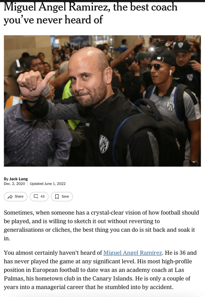 41-årige Miguel Ángel Ramírez, kallad MAR, är Malmö FF:s nye ”Mister”. Han har gjort fem, sex säsonger som huvudtränare för seniorer. Innan dess var han ungdomstränare, vilket jag tycker är en stor merit eftersom många av de allsvenska tränare inte har den erfarenhet av att blanda tålamod med auktoritet och pedagogik. Plus att många spelare idag fortfarande är närmast barn, tonåringar, (reellt eller mentalt) som glidit igenom ungdomssäsongerna likt curlade småstjärnor.